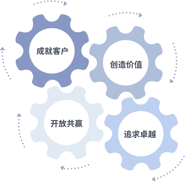 成就客户是一切决策的出发点,,,,创造价值是衡量所有工作的标准,,追求卓越是我们做事做人的态度,,,,开放共赢是我们的格局也是最终的结果。。。。价值观的齿轮环环相扣,,推动着组织里的每个人不断向前。。